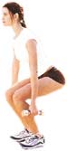 Приседания. Встаньте прямо, ноги на ширине плеч, носки смотрят вперед. Руки с гантелями свободно опущены ладонями вовнутрь. Напрягите пресс, расправьте грудную клетку. Начните выполнять приседания, сгибая колени до тех пор, пока бедра не будут параллельны земле. Выпрямите ноги. Для начинающих – 2 подхода по 15-25 повторов.