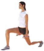 Выпад в движении. Исходная позиция, как и в предыдущем упражнении. Удерживая корпус прямо, сделайте большой шаг вперед правой ногой и опуститесь в выпад: правое колено точно над лодыжкой, левое смотрит в землю, пятка приподнята. Выпрямив обе ноги, левую приставьте к правой. Затем, не задерживаясь, шагните ею вперед и повторите выпад. Для начинающих – 2 подхода по 10-15 повторов.