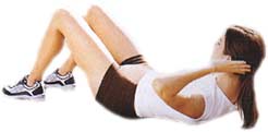 Пресс. Лягте на спину, согните колени, поставьте ступни на коврик. Положите ладони на затылок (при этом пальцы не смыкайте) и разведите локти в стороны. Напрягите пресс. Оторвите от коврика голову, шею и лопатки. Вернитесь в исходную позицию. Для начинающих – 2 подхода по 25-50 повтров.