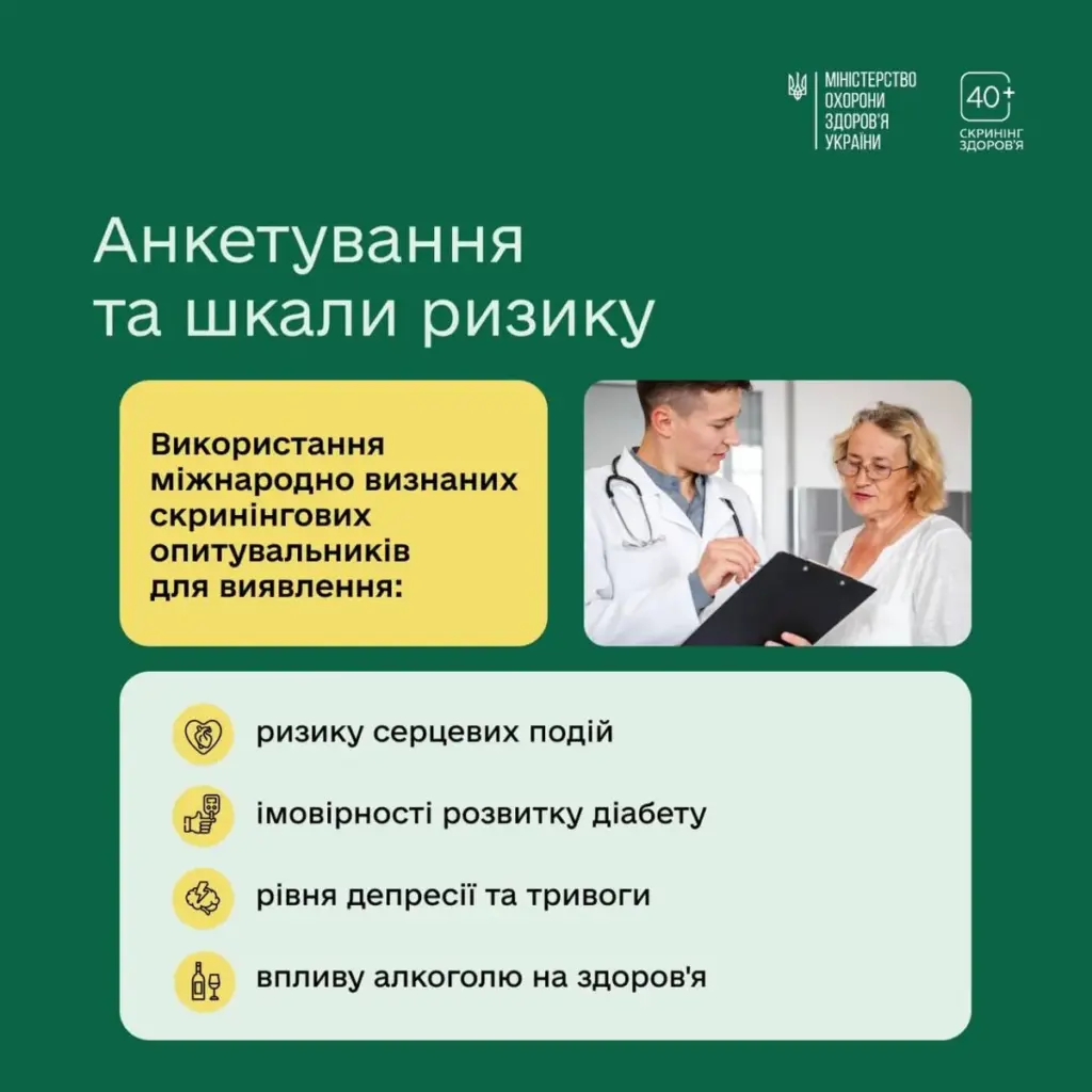 У рамках програми «Скринінг здоров’я 40+» українці віком від 40 років можуть на ранніх етапах оцінити ризики для здоров’я, зокрема серцево-судинних захворювань, розвитку цукрового діабету та стану психічного здоров’я.