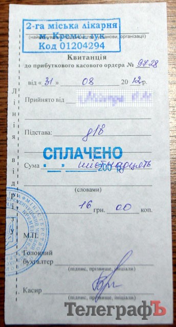 Сергій Григорович розповідає, що його із донькою направили до каси, там видали бланк заяви, в якому він мав вписати свої дані та внести добровільні пожертвування «для... розвитку матеріально-технічної бази Кременчуцької ЦРЛ».
