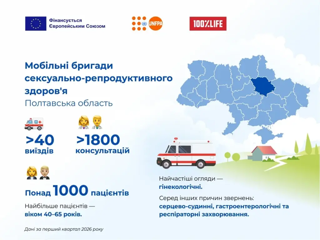 У Полтавській області мобільні гінекологічні бригади продовжують виїжджати у громади, де жінкам складно дістатися до лікаря. Лише за перший квартал 2026 року медики здійснили понад 40 виїздів і надали більш як 1800 консультацій.
