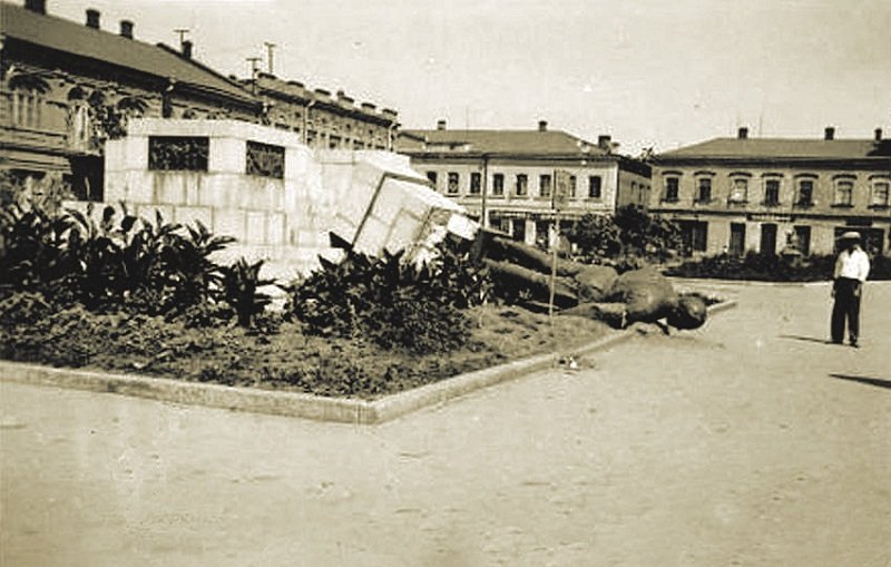 Над памятником надругались немецко-фашистские захватчики – сбросили на землю, сорвали табличку «Ленин».
