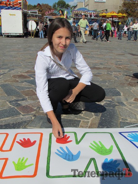 Кременчужане на площади Победы на специальном стенде могут оставить пожелания родному городу. На стенд жители города приклеивают вырезанные ладошки с пожеланиями. «Ладошки», клей и фломастер можно получить у организаторов акции.