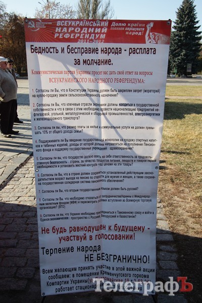 На митинг пришло не более 150 человек. Зато все желающие смогли принять участие во всеукраинском референдуме и ответить на вопросы типа «Согласны ли вы с тем, что размер платы за жилье не должен превышать 10 % от общего дохода семьи?» Местные члены Компартии говорят, что уже собрали около 5 тысяч подписей.