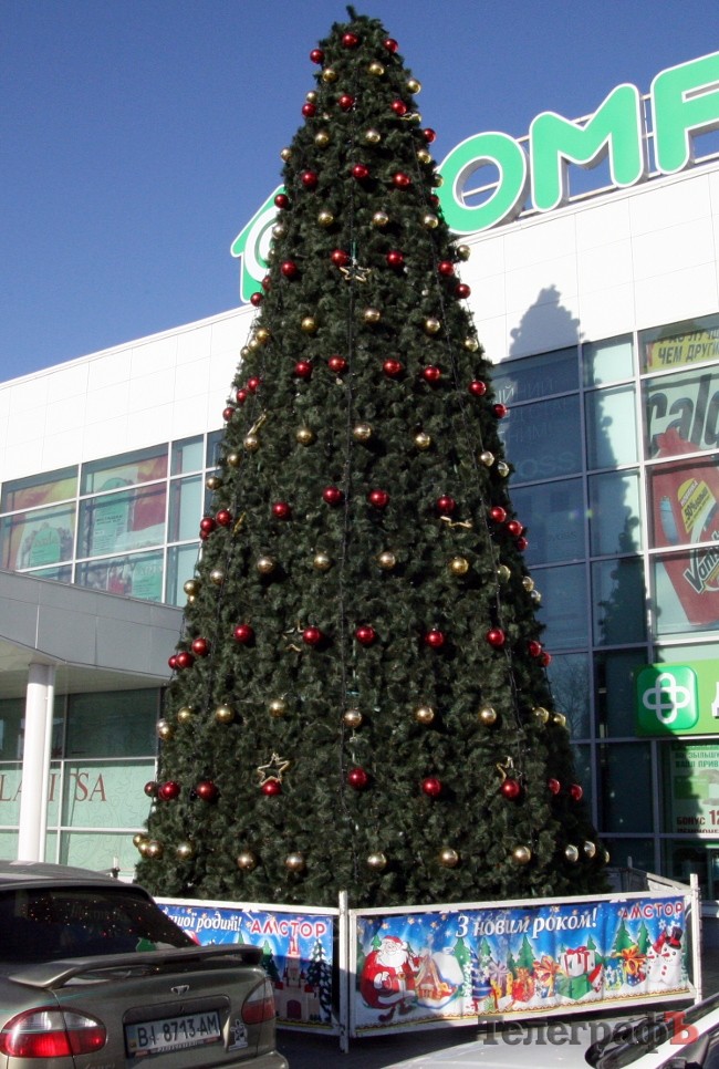 В Кременчуге на прошлой неделе установили первую новогоднюю елку - возле "Амстора". Украшена елка большими шарами и звездочками.