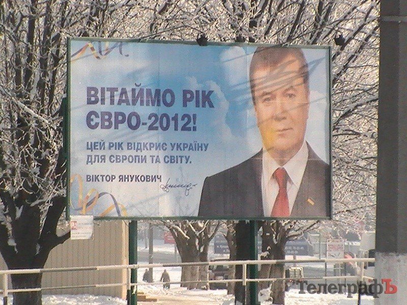 В ночь со среды на четверг в Кременчуге неизвестные испортили биллборды с изображением Президента Украины Виктора Януковича. На одном из них у Президента на правой щеке расплылось желтое пятно (см.фото). Этот биллборд был размещен на «пивзаводском кругу» (круг рядом с остановкой «Пивзавод»). Также испорчены биллборды по ул. 60 лет Октября, Киевской. В рекламных фирмах говорят, что биллборды забросали краской только в нагорной части города и только те, на которых изображен Президент.
