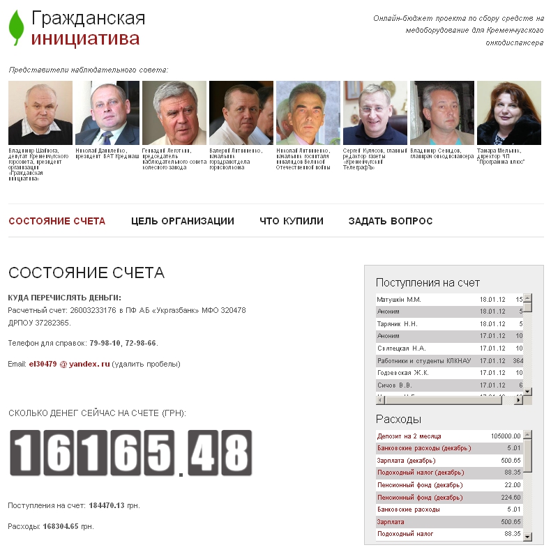 В декабре 2011 года 105 тыс грн, собранных кременчужанами ранее были положены на 2-месячный депозит в банке на период с 27 декабря 2011 по 23 февраля 2012 под 19% годовых. Ожидаемый доход – около 3100 гривен.