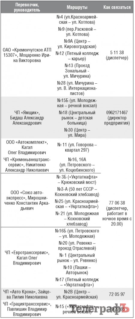 Согласно с условиями договора, заключенного между перевозчиками и городскими властями, с 6.00 до 23.00 проезд должен составлять 2 грн. До 22.00 по городу должны курсировать и маршрутки, работающие в обычном режиме, перевозящие пассажиров по 1.25 грн. Если эти правила нарушаются, то на водителя можно пожаловаться в мэрию, в отдел транспорта. Телефон: 3-20-47.