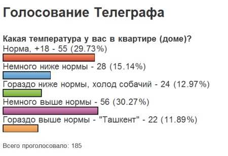 На первой странице нашего сайта мы попросили кременчужан проголосовать, соответствует ли норме +18 градусов температура в их квартирах. Как свидетельствуют первые результаты голосования за вчерашний день, у большинства людей, принявших участие в опросе, в квартирах норма или даже выше. Но пик холодов только наступил, и голосование открыто. А под этой носовстью вы можете оставлять комментарии и писать конкретные адреса, где слишком жарко или холодно.