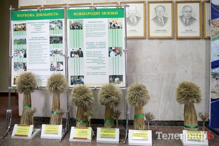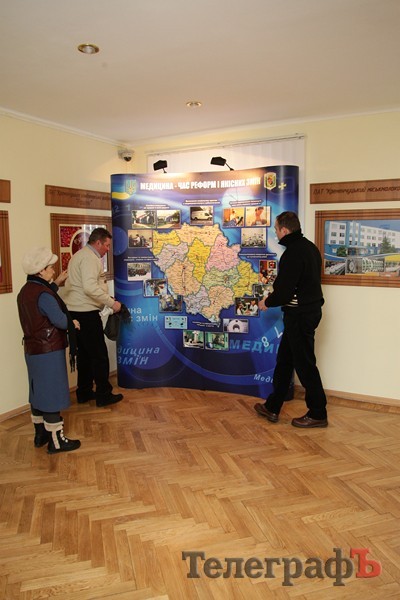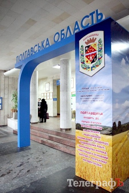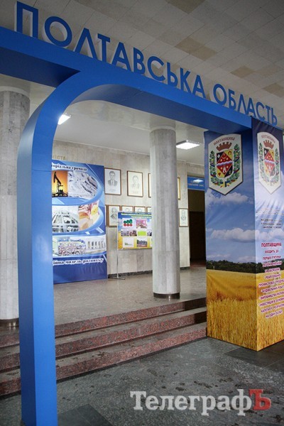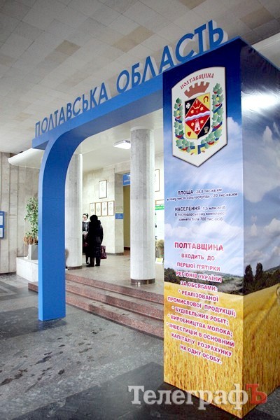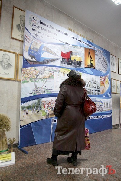В холле горисполкома решили устроить экспозицию достижений Полтавщины. Для этого поверх портретов почетных граждан города повесили баннер, который иллюстрирует программу экономических реформ Президента Януковича.