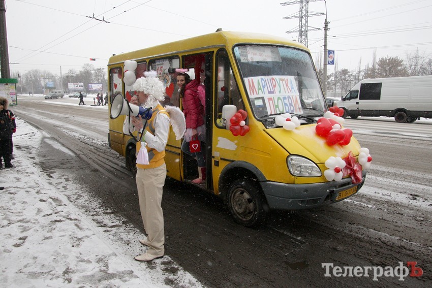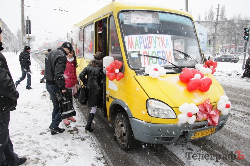 14 февраля по Кременчугу ездила "маршрутка любви". Данную акцию проводит газета «Кременчугский ТелеграфЪ» уже третий год подряд. Над украшением необычного транспорта "креативила" студия "Декоратор". Благодаря праздничным сердечкам, воздушным шарам и другой соответствующей Дню Святого Валентина атрибутике, обычная маршрутка превратилась в "Маршрутку любви".