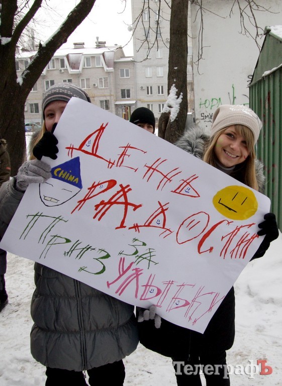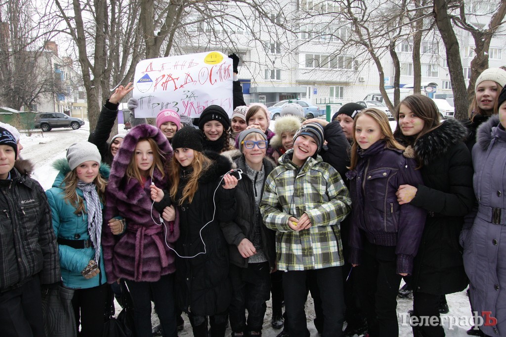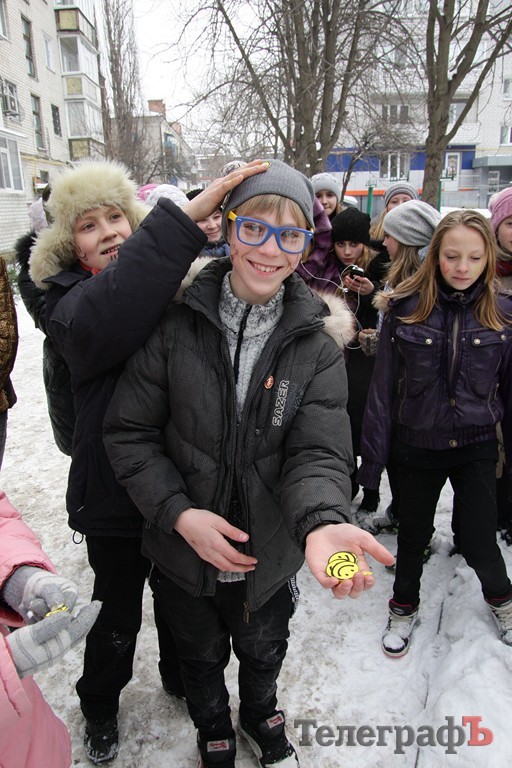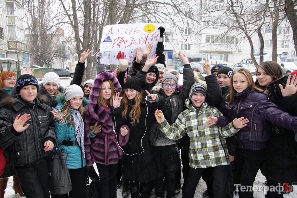 Сегодня, 17 февраля, прохожие наблюдают в Кременчуге интересную картину: по улицам ходят улыбающиеся школьники с разукрашенными лицами и дарят наклейки-смайлики прохожим.