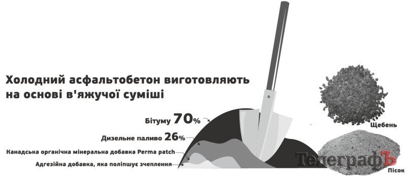 Холодный асфальтобетон изготавливают на основе вяжущей смеси: битума, дизельного топлива, канадской органической минеральной добавки Perma patch и адгезийной добавки, улучшающей сцепление материала с поверхностью. Все это смешивают с песком и щебнем в асфальтосмесительной установке. По словам руководителя ДРСУ, главный секрет – как раз в канадской добавке. Благодаря ей, холодный асфальтобетон не застывает на складе. Если температура плюсовая, смесь даже не подогревают, а используют для зимнего ремонта в холодном виде: он все равно «прилипает» при трамбовании. При минусовой температуре асфальтобетон нагревают до 20 градусов.