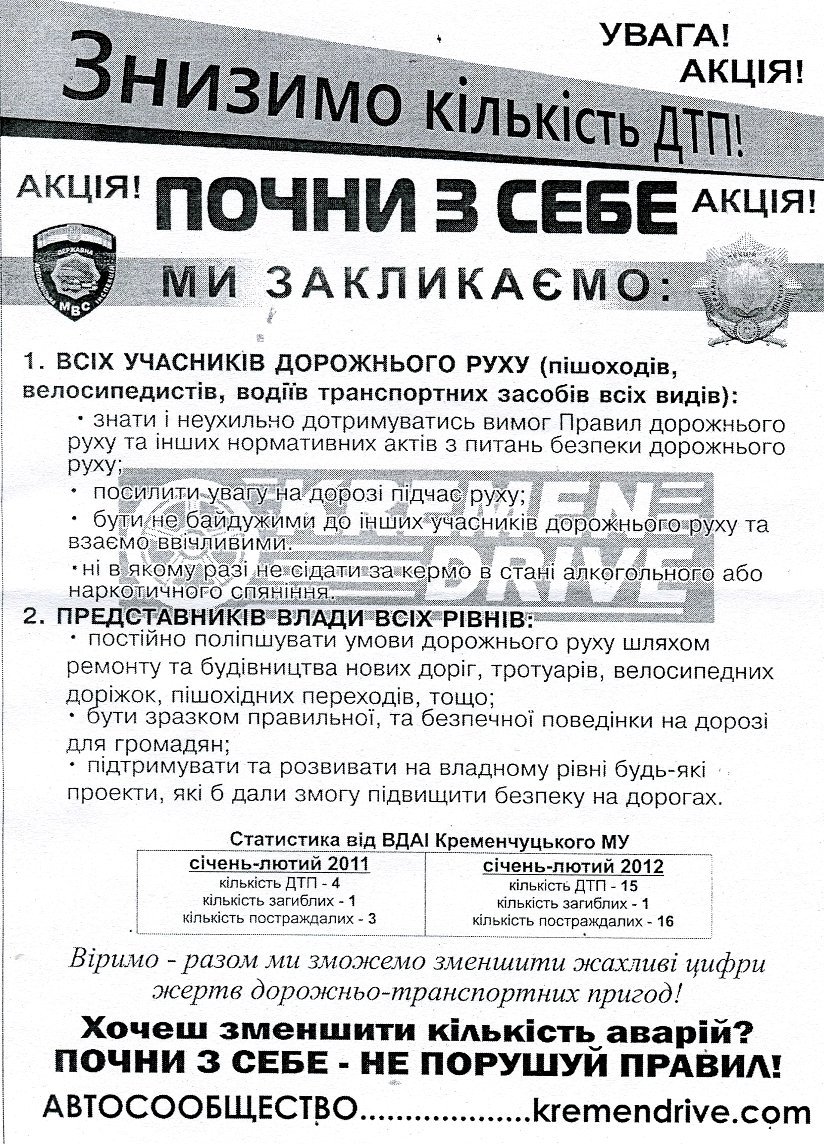 В Кременчуге автолюбители и ГАИ призывали водителей и пешеходов не нарушать ПДД. Третьего марта городское сообщество автомобилистов KremenDrive провелоло акцию «Начни с себя» – они раздавали листовки прохожим, автомобилистам. В районе ДК «КрАЗ» инспекторы останавливали проезжавших кременчужан и волонтёры призывали их ездить так, чтоб количество ДТП в городе постоянно снижалось. А статистика неутешительна. По словам начальника городского отдела ГАИ Виктора Самойленко, в январе-феврале 2012 года уже погиб один кременчужанин и 16 травмировались (в 2011 году погиб 1 человек и травмировались 3).