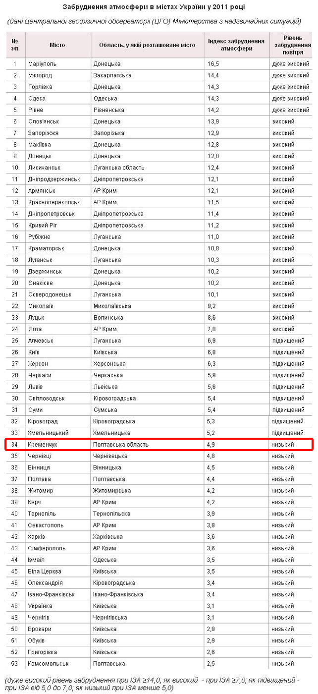 Кременчуг в рейтинге находится на 34 месте. Уровень загрязненности воздуха у нас, по данным Центральной геофизической обсерватории МЧС, низкий. Индекс загрязнения атмосферы - 4,9.
