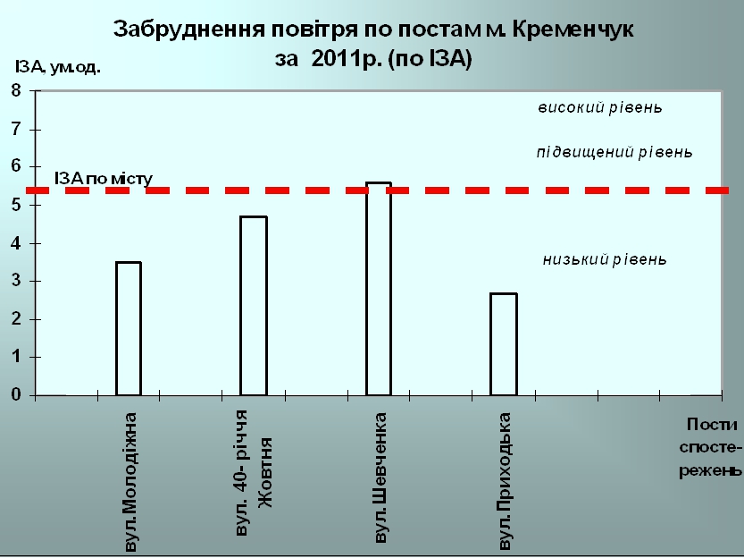 Напомним, по данным Кременчугской лаборатории по наблюдению за загрязнением атмосферного воздуха, по индексу загрязнения атмосферного воздуха (ИЗА) общий уровень загрязнения в целом по Кременчугу в 2011 году характеризовался как повышенный (5,3). Основными примесями, которые определяли «букет», которым дышали кременчужане, оказались формальдегид, пыль, бензол, оксид углерода и диоксид азота.