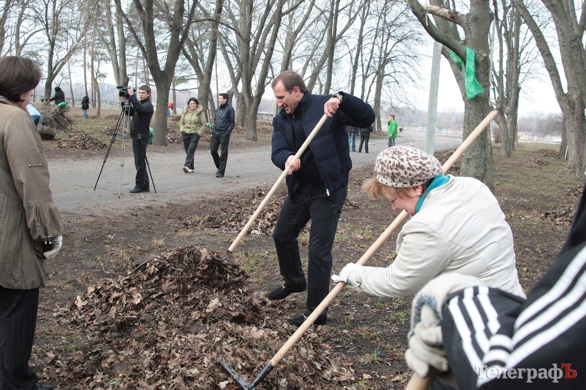 31 марта члены горисполкома вышли на субботник в Приднепровский парк. Вышли бодро и под музыку. Журналисты обратили внимание, что многих руководителей они впервые увидели без костюма и галстука, не за компьютером, с ручкой и блокнотом, а с граблями и лопатами в руках.