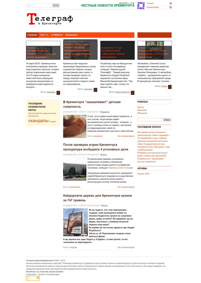 В сети Интернет появился сайт-клон «Кременчугского Телеграфа» – «Телеграф в Кременчуге». Интернет-издание имеет не только схожее название и адрес в интернете с ведущим информационным ресурсом Полтавщины «Кременчугский Телеграф», но и использует зарегистрированный товарный знак «Телеграф».
