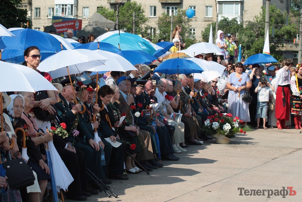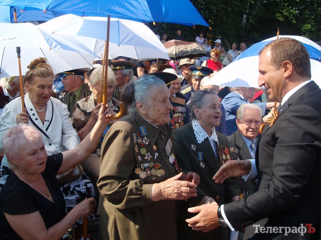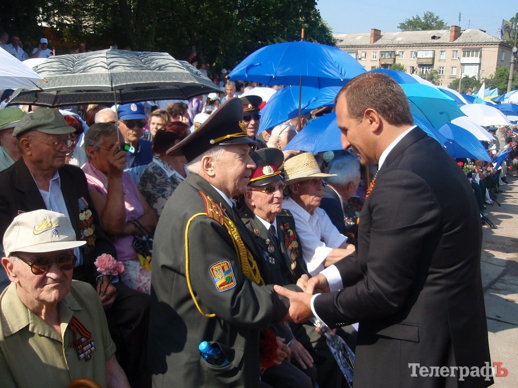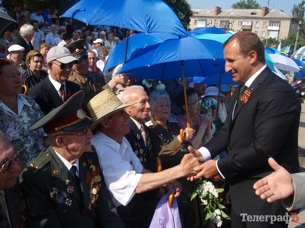 - День Победы дался нелегко. Мы благодарны вам за то, что вы сделали для наших поколений. Вы сделали наше небо чистым и голубым! Вы навсегда покончили с этим страшным врагом, с коричневой чумой под названием фашизм. Вам пришлось отстраивать разрушенную страну... Наше поколение будет делать все, чтобы наши дети и внуки знали историю этой войны, знали ваш подвиг!.. сегодня великая честь продолжать ваши традиции, великая честь делать город чище лучше и краше, и я хочу вас сегодня заверить, что с каждым годом наш город будет добиваться первых мест в Украине. Мы будем делать дороги, строить стадионы. Будем ухаживать за парками и развивать скверы, будем ремонтировать жилье, больницы, школы, детсадики, и нам не будет стыдно смотреть вам - ветеранам - в глаза!,-сказал мэр.