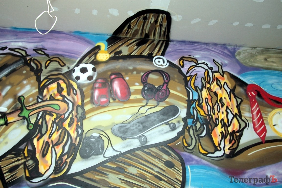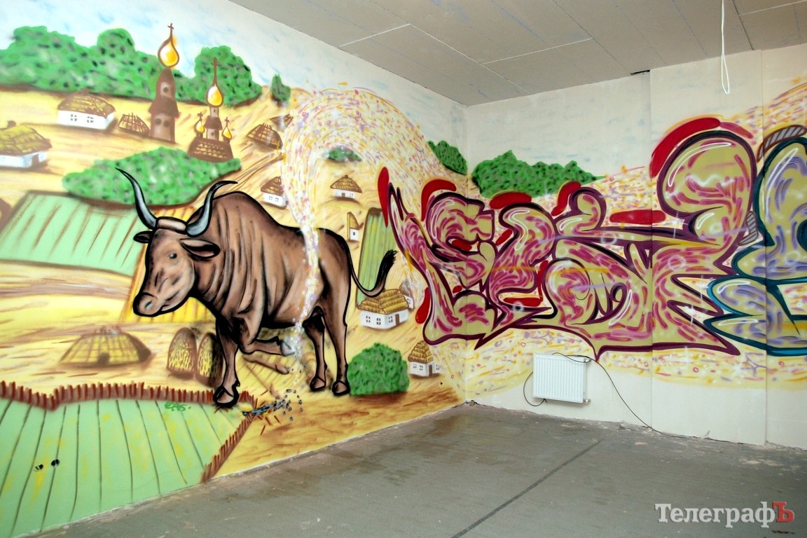 Во-первых, на отштукатуренной стене в холле появился громадный украинский пейзаж. В центре — вол, символизирующий традиции чумаков и крепость, мощь украинского народа. Но это еще не все: этнокартинка плавно перетекает в граффити. Как пояснила экскурсовод музея — это диалог между традиционностью и новаторством.