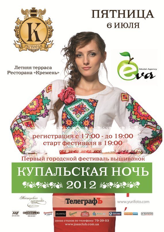 6 июля в Кременчуге пройдёт первый фестиваль вышиванок «Купальская ночь 2012». Гостей ждут к 19.00 на террасе ресторана «Кремень» (ул. Октябрьская, 1).