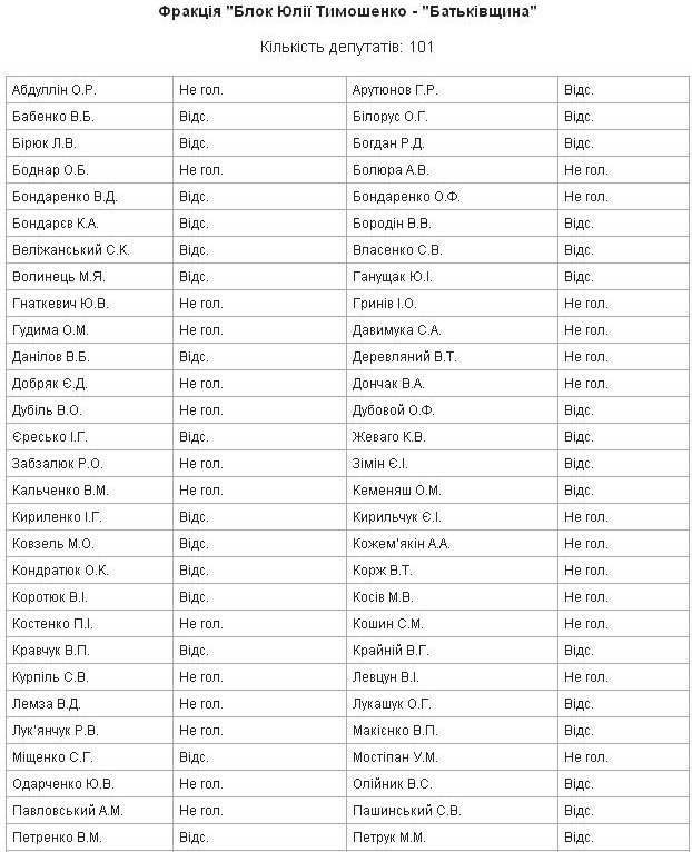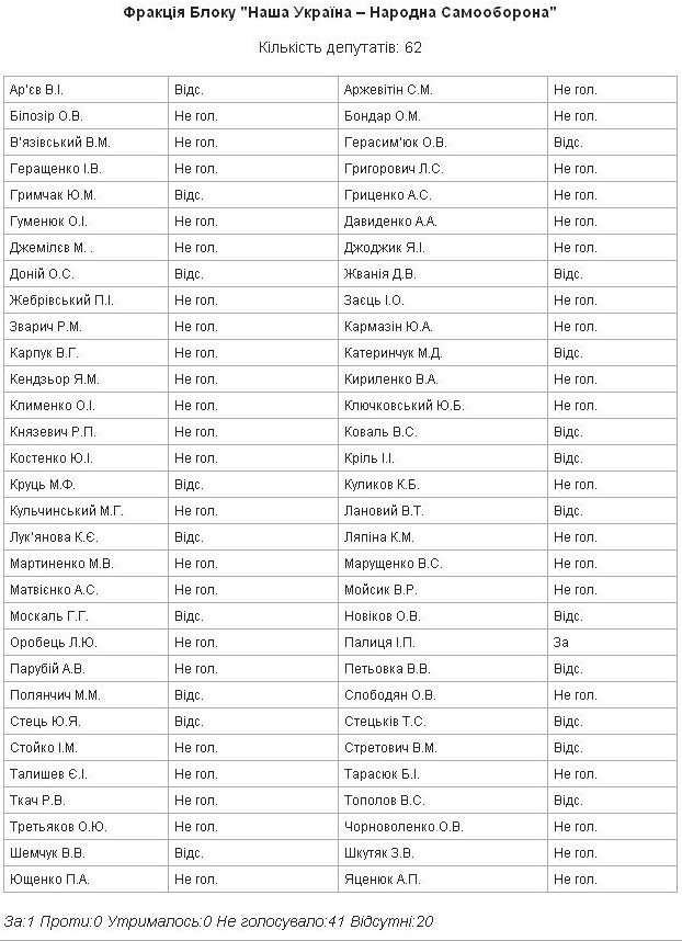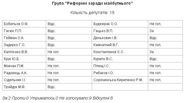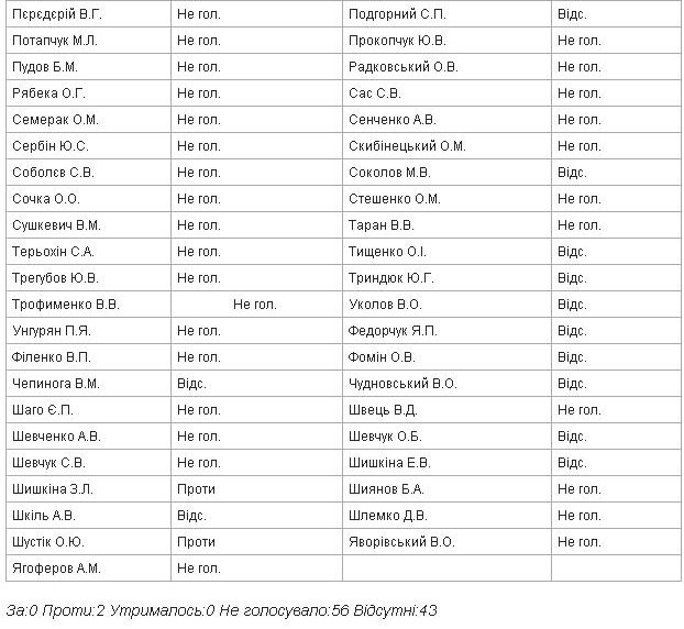 В полном составе проголосовали 25 депутатов фракции КПУ и 19 из 20 депутатов фракции Народной партии. Не голосовал депутат из Народной партии Николай Рудченко. Решение принято 248 депутатами.