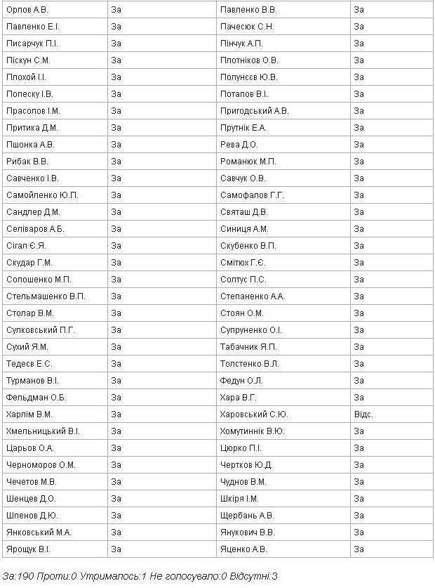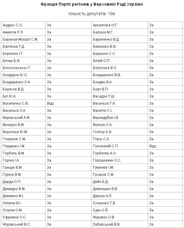 При этом, если посмотреть на список голосовавших, то не все регионалы голосовали за принятие Закона. "За" языковой закон проголосовали 190 из 194 депутатов фракции Партии регионов.