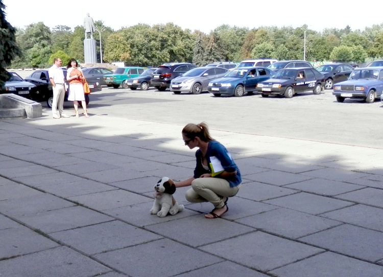Волонтеры при помощи игрушечного пса и пистолета, разыграли перед мэрией театрализованное действие.
