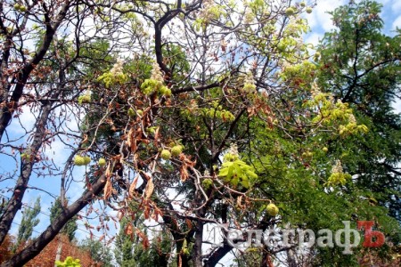 В Кременчуге, второй раз за сезон, расцвели каштаны. Сегодня сразу несколько деревьев со свечками цветов каштана можно увидеть по улице Красина, в районе стадиона школы № 19.