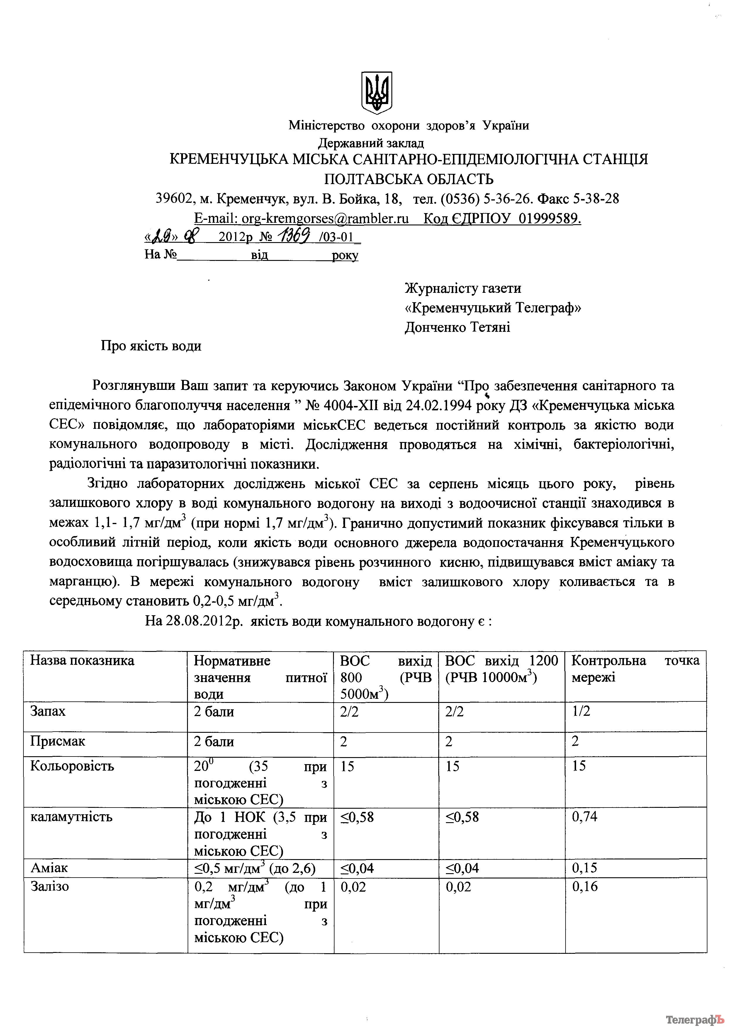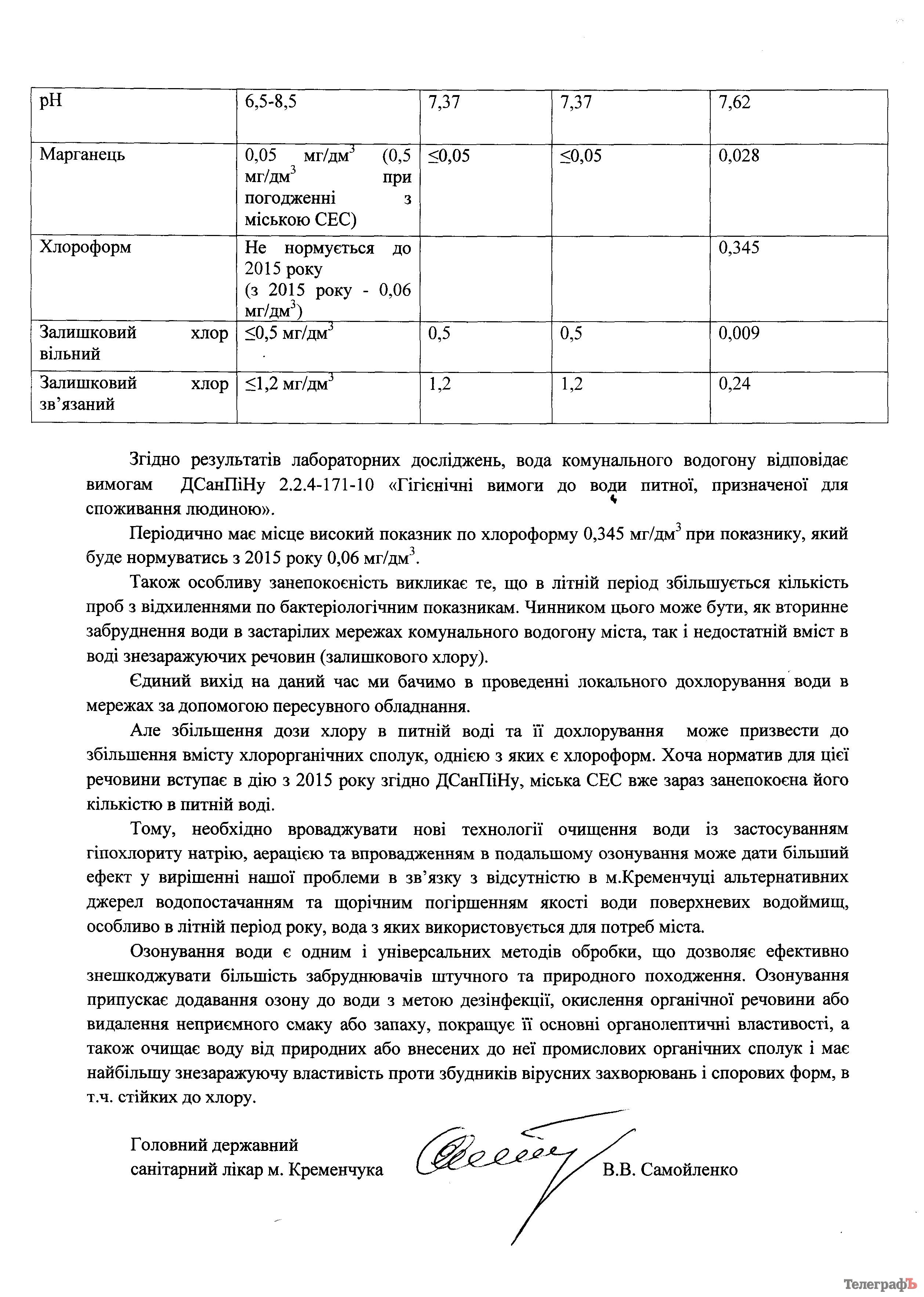 Как стало известно «Телеграфу» из ответа главного санврача на наш информационный запрос, содержание хлороформа в питьевой воде кременчугского водопровода почти в 6 раз превышает величину, обусловленную в ДСанПіН 2.2.4-171-10 — 0,06 мг/дм³. В Кременчуге, по данным последнего исследования СЭС — 0,345 мг/ дм³