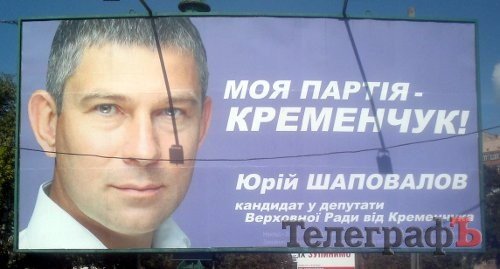 – Я ехала в маршрутке и увидела в районе остановки «Горводоканал» два билл-борда, которые размещены буквально друг за другом. На одном кандидат Шаповалов говорит «Моя партия – Кременчуг», а на другом другой кандидат Безкоровайный, точно также утверждает, что его партия – Кременчуг. Билл-борды отличаются разве что фотографиями и еще какими то мелочами. Насколько я читала у вас в газете – эти кандидаты идут самостоятельно и они конкуренты. Тогда почему у них один слоган на двоих? Или это специально договорились, расскажите, – с такой просьбой обратилась к нам читательница «Телеграфа» Людмила.