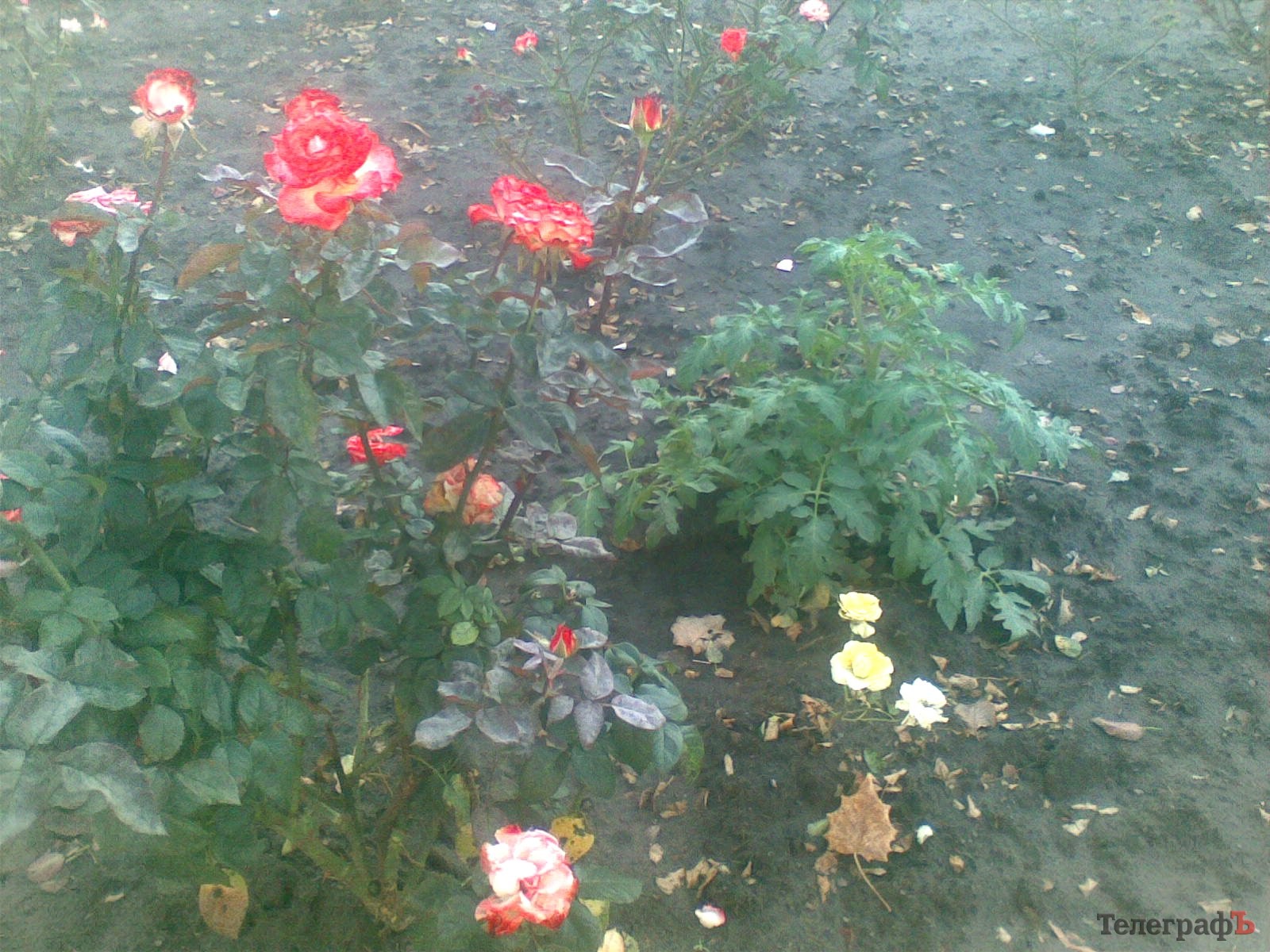 Вот такую, радующую глаз огородника, картину можно увидеть на разделительной полосе в районе перекрёстка ул. 60 лет Октября и пер. Героев Бреста. Вместе с розовыми кустами вырос томатный. Ему здесь явно хорошо – ни намёка на сухость или недостаток удобрений. Правда, плодов ещё нет, видимо, поздно высадился.