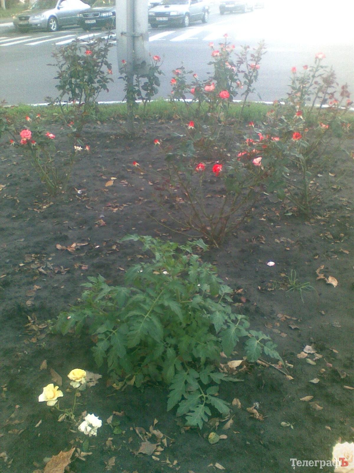 На разделительной полосе в районе перекрёстка ул. 60 лет Октября и пер. Героев Бреста на розовой клумбе вырос добротный томатный куст.