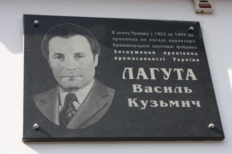 В Кременчуге торжественно открыли мемориальную доску бывшему директору обувной фабрики Василию Лагуте. Мемориальная доска установлена по инициативе ассоциации директоров предприятий Кременчуга на здании бывшей Кременчугской обувной фабрики.