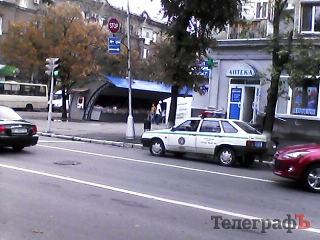 Автомобиль ГАИ остановился в районе пешеходного перехода. Инспектор пошёл в аптеку. Фото прислал Юрий
