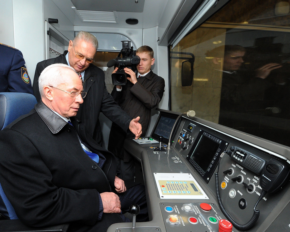 Затем премьер-министр и Владимир Приходько прошли в головной вагон нового поезда. В кабине премьер-министр сел в кресло машиниста: