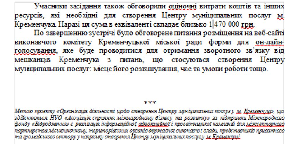 Сегодня, 22 ноября, редакция «Телеграфа» получила пресс-релиз от общественной организации «Ассоциации содействия международному бизнесу и развитию» (АСМБР). В нем идет речь о том, что 22 ноября в малом зале № 1 горисполкома было проведено третье заседание рабочей группы в рамках проекта «Организация деятельности по созданию Центра муниципальных услуг (ЦМП) в г. Кременчуге». АСМБ реализует этот проект при финансовой поддержке Программы «Гражданское общество и надлежащее управление» Международного фонда «Возрождение». Партнерами в выполнении проекта является исполком Кременчугского городского совета и Городское коммунальное предприятие «Міськоформлення», сказано в сообщении.