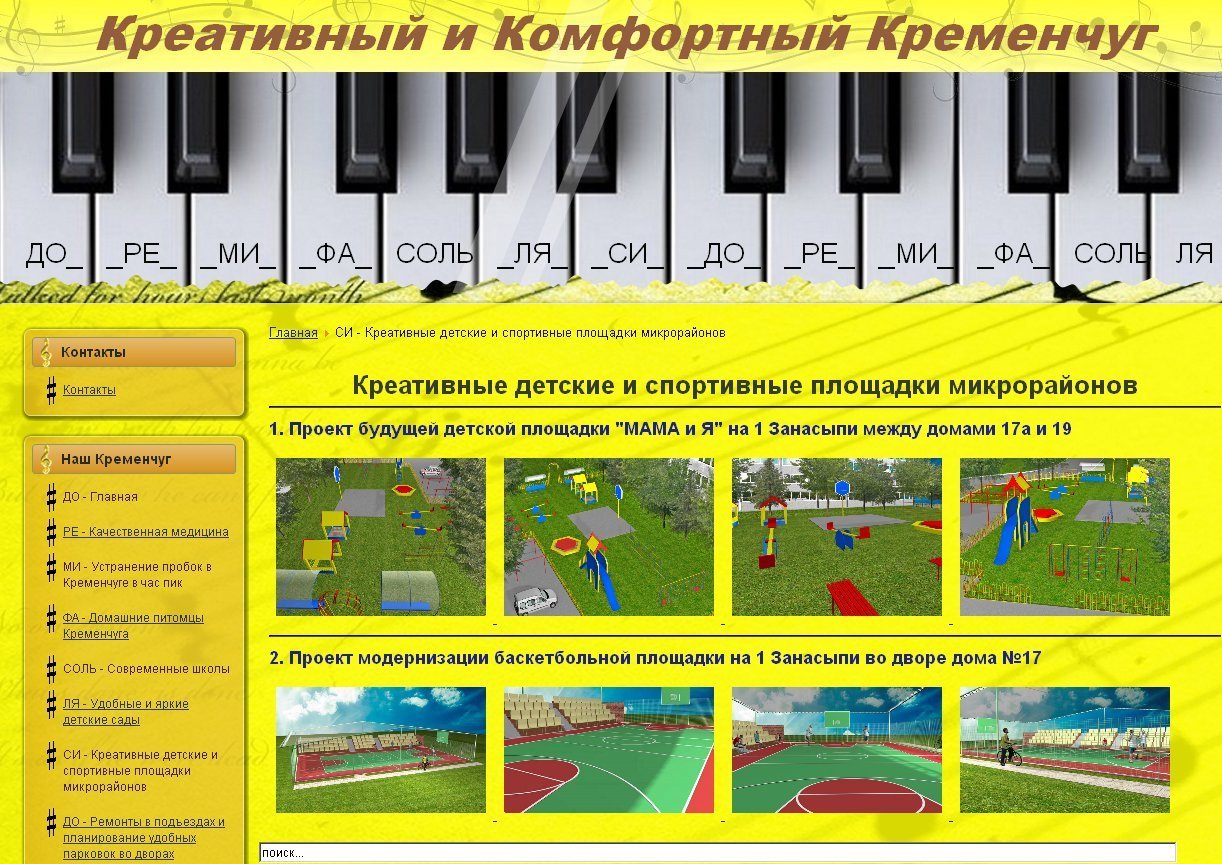В Интернете появился сайт «Креативный и комфортный Кременчуг». Он находится по адресу newkremenchuk.com. Перед посетителями открывается меню в виде клавиш пианино. Каждая нота соответствует той или иной сфере жизни Кременчуга, которые предлагает усовершенствовать Александр Лынтвар – владелец сайта и очень инициативный молодой человек.