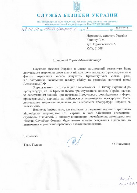 Вчера заместитель руководителя квартирного управления Кременчуга Геннадий Алексеев, заявил, что по отношению к нему никаких обвинений в получении взятки выдвинуто не было. Сегодня «ТелеграфЪ» получил официальные документы по делу Алексеева. Печатаем их фотокопии.