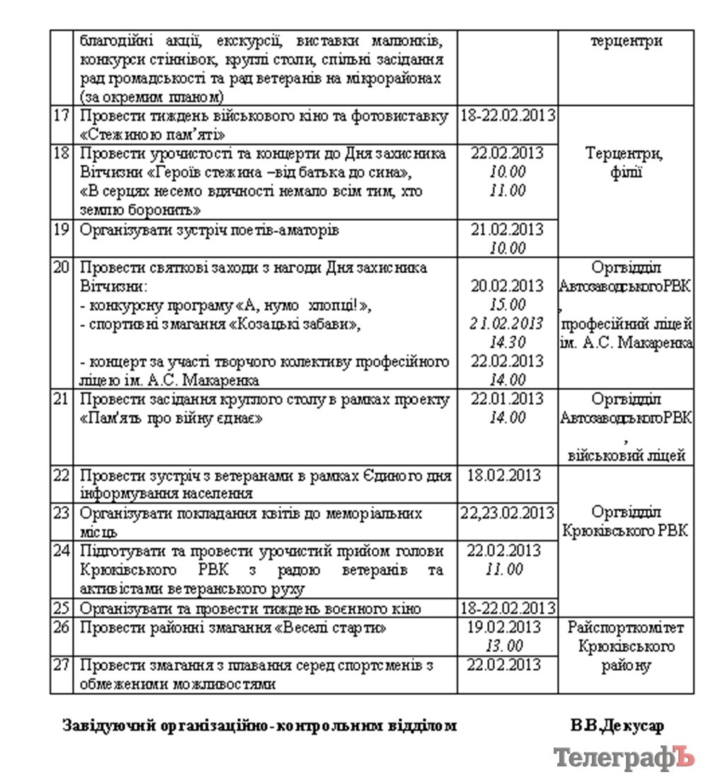 Ко Дню защитника Отечества 23 февраля кременчугских ветеранов, которые практически не выходят из дома и находятся на социальном обслуживании, посетят и поздравят на дому. За это отвечают орготделы исполкомов, советы ветеранов, территориальные центры в районах. На сегодня в городе более 550 таких ветеранов.