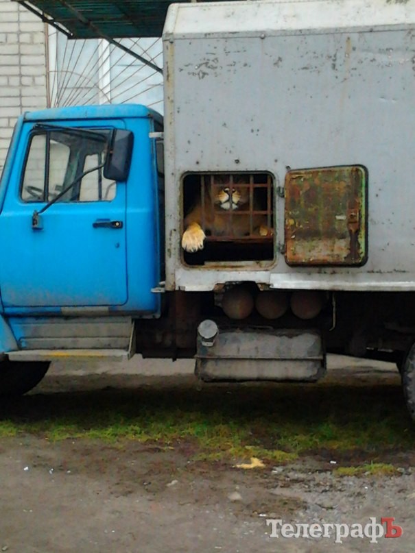 В Кременчуге, на Молодежном, в грузовом фургоне живут две львицы. Они в нашем городе отдыхают между гастролями, пока их хозяин-дресировщик Анатолий занимается оформлением деловых бумаг.