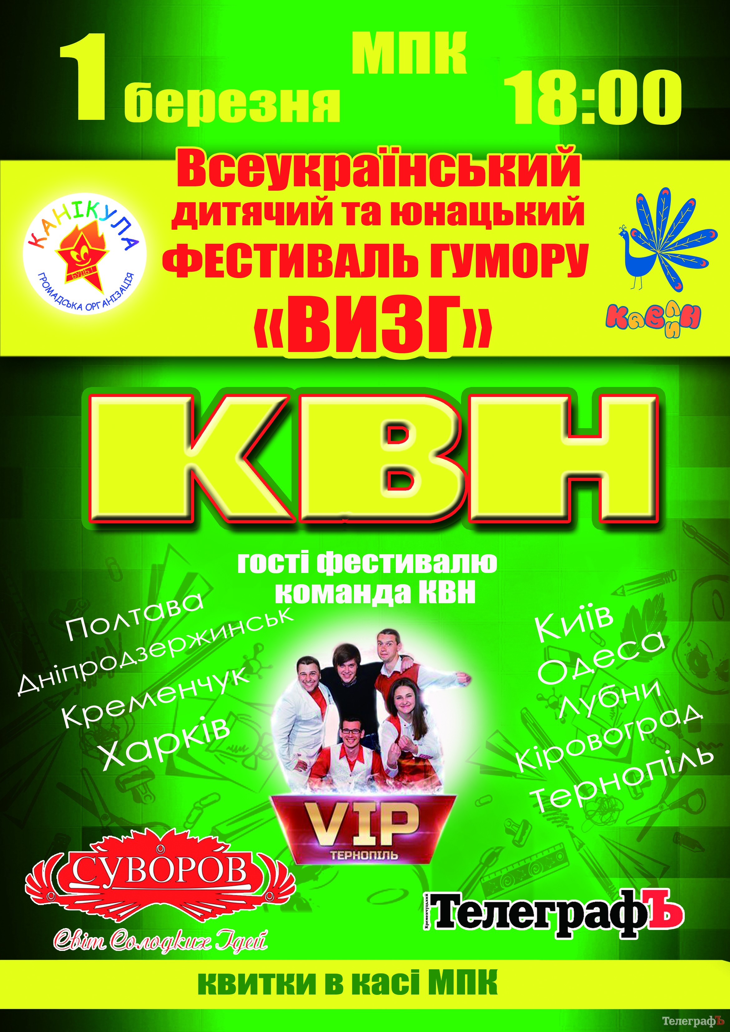 1 марта в Кременчуге состоится Всеукраинский детско-юношеский фестиваль юмора «ВИЗГ – 2013» . Организаторы мероприятия - команда Волшебники ИЗумрудного Города – общественная организация «КАНИКУЛА» и Кременчугская лига КВН «КаВлиН».
