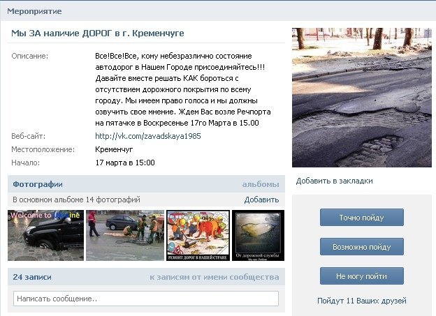 Инициаторы приглашают всех недовольных дорогами в Кременчуге присоединяться к их группе – «Мы ЗА наличие ДОРОГ в г. Кременчуге».