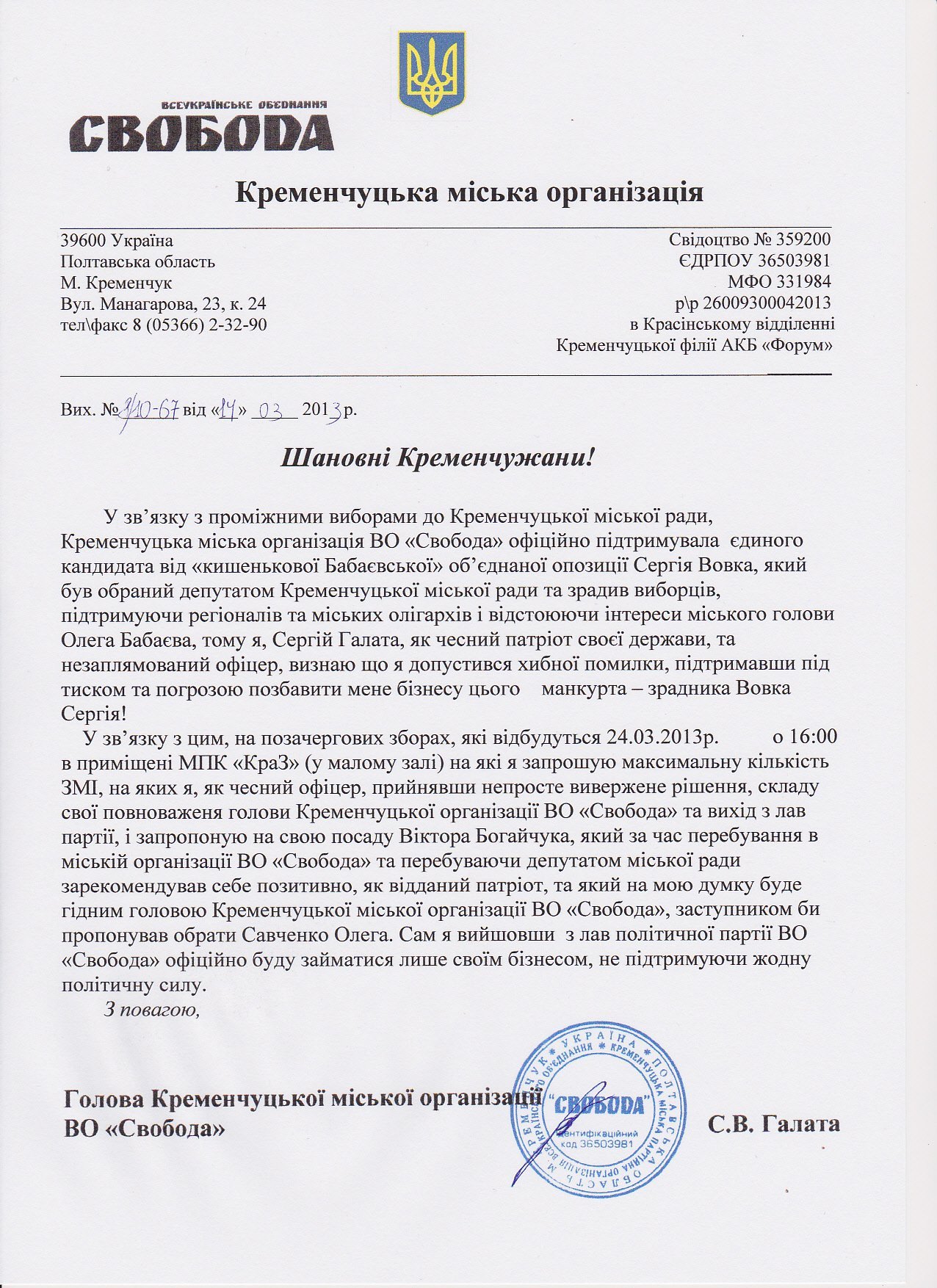 Далее C.Галата пишет, что «на внеочередном собрании, которое состоится 24 марта в 16:00 в помещении ДК «КрАЗ» он сложит полномочия председателя Кременчугской организации ВО «Свобода» и выйдет из партии, предложив на должность Виктора Бугайчука, который за время пребывания в городской организации ВО «Свобода» и работая депутатом городского совета зарекомендовал себя положительно, как преданный патриот».