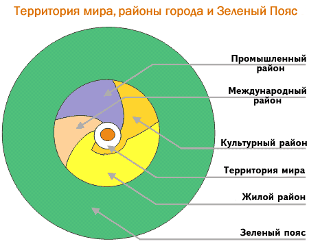 План города представляет собой окружность, в центре которой находится Матримандир. Вокруг – районы: культурный, жилой, промышленный, международный. Их, в свою очередь, опоясывает кольцо зеленых насаждений шириной более 1 километра. Все районы находятся в стадии развития: прокладываются коммуникации, разрабатывается схема транспортного сообщения. Промышленный район занимает 109 га. Это территория «зеленой индустрии» – предприятий, которые должны обеспечивать Ауровиль всем необходимым. Здесь находятся учебные центры, мастерские и производственные участки, а также городская администрация. Жилой район – 189 га. Со всех сторон его окружают парки, но и сам он на 55% состоит из зеленых насаждений, а 45% – застройка. Все-таки ауровильцы нашли баланс между городом и природой. Международный район в 74 га содержит национальные культурные павильоны стран мира. 93 га культурного района – это место для культурных, общеобразовательных, художественных и спортивных занятий.