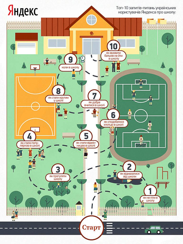 Но также встречаются и запросы от добросовестных учеников: [можна не йти в школу але не хочу пропускати що робити], [як сказати учителю що мене не буде в школі якщо на рахунку немає грошей]. Также школьников интересует [якої довжини має бути спідниця в школі] та [як добре вчитися в школі].