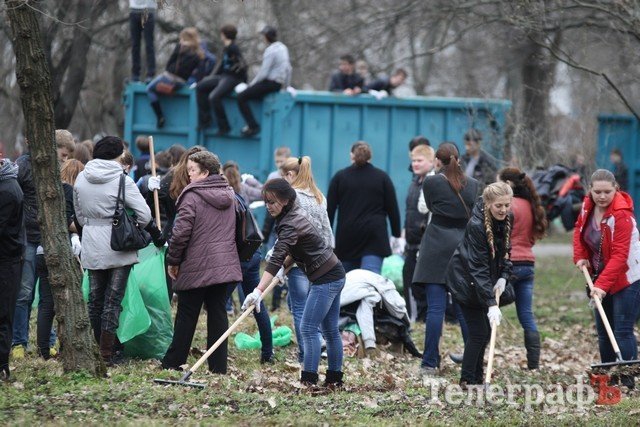 Более двух тысяч школьников и студентов в рамках экологической акции «Зелена толока» сегодня, 5 апреля, вышли убирать Приднепровский парк. Такое количество молодежи, вышедшей на уборку, удивило даже организаторов мероприятия, которые закупили 7500 мешков для мусора и 5000 пар рукавиц. Если мешков и рукавиц хватило, то с граблями вышла заминочка.