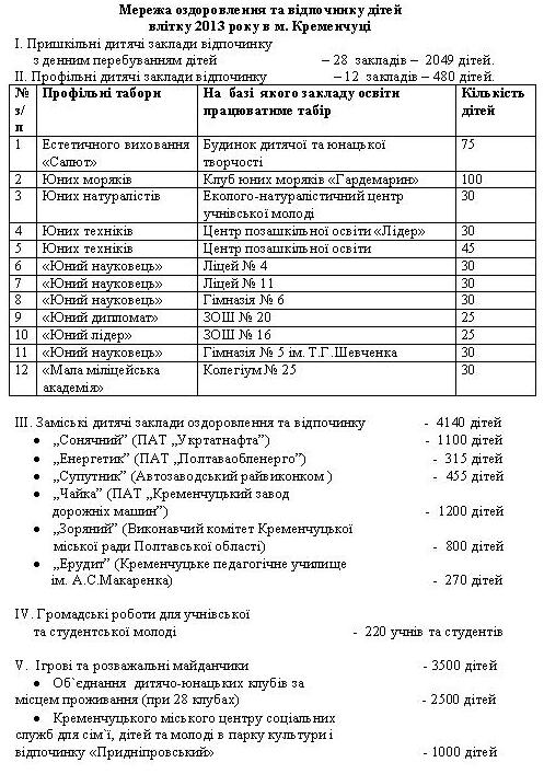 В 2013 году 4 тысячи маленьких кременчужан отдохнут в оздоровительных лагерях. Сеть заведений, в которых будут оздоравливать детей, уже утвердили на заседании исполнительного комитета горисполкома.