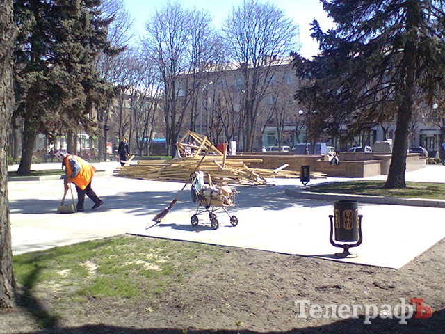 В Кременчуге начали готовить фонтан к летней работе. Сегодня, 16 апреля, его «расконсервировали» - сняли с фонтана зеленый брезент, которым его укрывали на зиму.